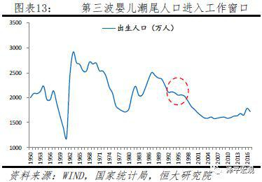 除十九大要求推进高质量发展外,第三波婴儿潮尾端人口进入工作窗口,人才争夺机遇期到来。中国第三轮婴儿潮的峰值在1987年、出生人口超过2500万,到1997年出生人口仍在2000万以上,之后则快速下滑至2003-2010年的1600万左右。在2016年初推行全面放开二孩后,2016年出生人口回升至1786万、较上年增加191万人,但2017年出生人口较2016年减少63万人,表明第四轮婴儿潮很弱。一般而言,人口在19岁高中(中职)毕业、23岁本科毕业,加上工作前几年多未安家定居,当前至2023年前后将仍处于第三波婴儿潮尾端人口进入工作的“抢人”时间窗口。