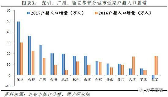 5)“抢人”效果:深圳、西安、成都、武汉等城市新落户人数暴增。深圳市2017年常住户籍人口增量49.7万,较2016年增长65.7%。西安放宽高校毕业生落户政策后,2017年新落户24万人,同比增长330%;2018年政策进一步调整为大中专以上毕业生只凭身份证和毕业证办理落户,一季度已迁入户籍人口24.49万。成都市从2017年7月发布人才新政后,至2018年5月中旬累计落户已超过18.7万人。武汉2017年新落户大学毕业生14.2万人,是前一年的约6倍;2018年一季度又新增落户大学毕业生3.9万人。特别是2018年5月天津启动“海河英才”行动计划后,不到24小时就有30万人登陆并下载“天津公安”APP办理落户申请,掀起一波“抢人”高潮。