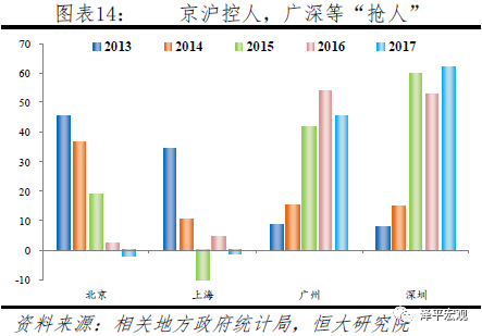 并且,京沪近几年大力控制人口、广深大力承接人口外溢,引起其他城市效仿,这使得城市人才争夺战在近两年爆发。北京、上海自2013年左右开始大力控制人口,常住人口增量在2014开始明显下滑,2017年双双出现负增长,常住人口分别为2171、2418万人。北京市要求到2020年及之后将常住人口控制在2300万人以内,上海市要求到2035年常住人口控制在2500万人左右,人口增量空间较小,特别是上海仅余82万人。
