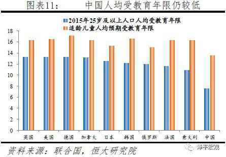 全国高学历人才比例虽快速上升,但人才供需仍是“僧多粥少”。1990-2015年,中国高中及以上学历人口占比从9.5%快速升至27.8%,其中大专及以上人口占总人口比重从1.4%升至12.4%。但是,与发达国家相比,中国人均受教育年限仍有较大提升空间。根据联合国《人类发展报告2016》,2015年中国25岁及以上人均受教育年限仅为7.6年,远低于美英德法日韩人均12年以上的水平。从适龄儿童人均预期受教育年限看,中国为13.5年,仍然明显低于发达经济体人均15年以上的水平。