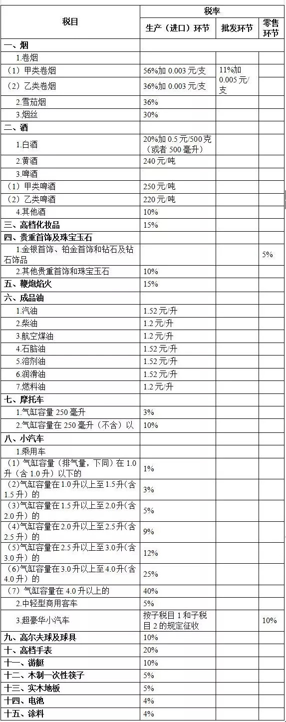 需要指出的是,按照此前公布的《财政部国家税务总局关于调整金银首饰消费税纳税环节有关问题的通知》以及《财政部国家税务总局关于对超豪华小汽车加征消费税有关事项的通知》,“金银首饰、铂金首饰和钻石及钻石饰品”和“超豪华小汽车”这两类商品在零售环节征收。