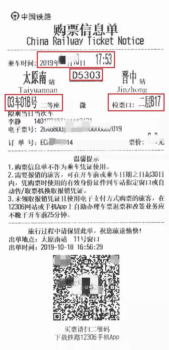 旅客还可以使用微信扫描报销凭证上的二维码查询车次、席位等信息,如下图所示。