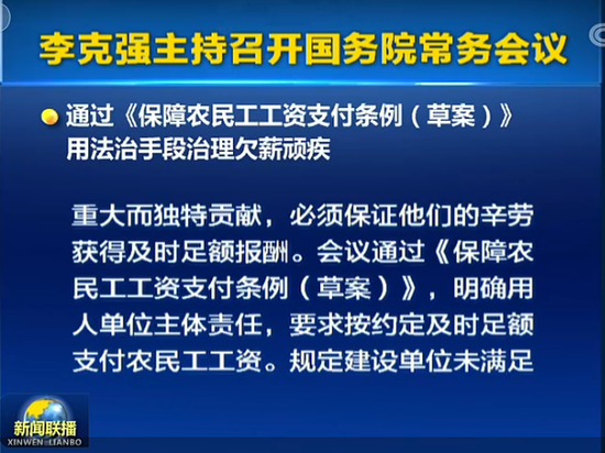 会议强调,农民工为国家发展作出重大而独特贡献,必须保证他们的辛劳获得及时足额报酬。会议通过《保障农民工工资支付条例(草案)》,明确用人单位主体责任,要求按约定及时足额支付农民工工资。规定建设单位未满足施工所需资金安排的不得开工建设,建立拖欠农民工工资“黑名单”,对拒不支付拖欠工资的可依法申请强制执行,涉嫌犯罪的移送司法机关处理。会议强调,各级政府和国有企事业单位不得以任何理由拖欠农民工工资。各地要把政府投资项目作为治理重点,明确责任限期清欠,对问题突出的要公开曝光,对相关责任人和单位严肃追责并予以惩戒。