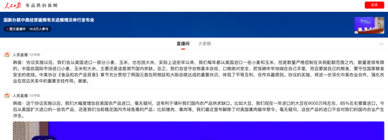 韩俊:今后从美国扩大进口的一些农产品,还是我们当前稳定国内市场急需的产品;比如猪肉、禽肉等,我们最近宣布解除了对美国禽肉输华禁令。毫无疑问,这些产品的进口不会对我们的国内农业产生冲击。