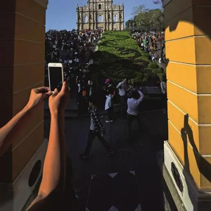 游客在澳门大三巴牌坊前拍照。图/中新