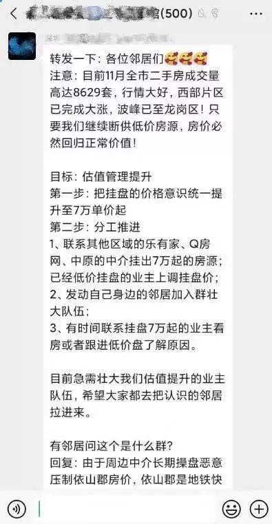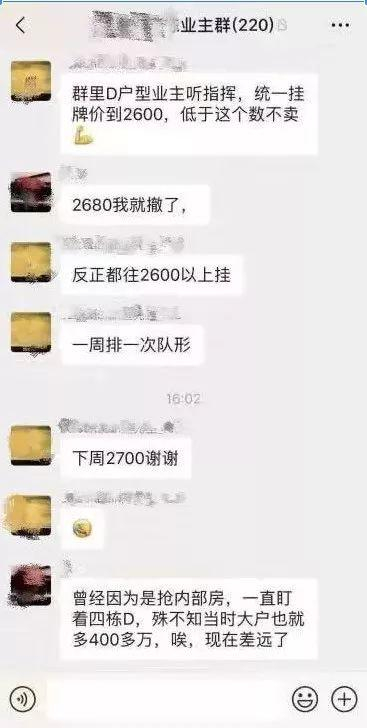 为的不是卖房,而是把整体的房价炒起来,然后再慢慢卖。甚至有的业主,还在群里号召建立“价格攻守同盟群”。