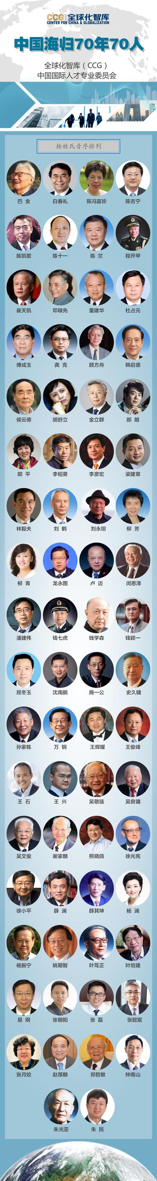 被誉为中国现代文坛“六大楷模”之一的巴金,带领中科院实现了中国科研机构在海外零突破的白春礼,中华人民共和国第十任驻美大使崔天凯,为全球其他城市治理大气污染提供了“北京经验”的北京市委副书记、市长陈吉宁, 第一位受聘于世界顶级柏林爱乐乐团和美国五大交响乐团的中国钢琴家郎朗,建立了全球最大的中文搜索引擎的李彦宏,让“女排精神”成为中国体育的一面旗帜的中国女排总教练郎平,助力中国打开世贸组织大门、融入全球贸易体系、开启中国改革开放的新时代的龙永图,被誉为“中国航天之父”、“中国导弹之父”、“中国自动化控制之父”的“两弹一星”功勋奖章获得者钱学森,中国海归研究第一人、首个进入世界百强的中国社会智库的创办者王辉耀,打破了国际法律服务领域由外国律师垄断的局面、成为中国律师走向世界的一面旗帜的王俊峰,作为申奥大使曾两次代表中国申请奥运会主办权的著名主持人杨澜,执掌中信资本、主导收购全球最大跨国快餐连锁企业麦当劳中国项目的张懿宸,至今唯一获得戛纳国际电影节金棕榈奖的华人导演陈凯歌等人入选“2019年度中国海归70年70人”。