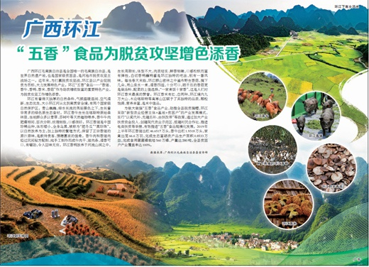 广西环江毛南族自治县是全国唯一的毛南族自治县,是世界自然遗产地,也是国家级贫困县,是河池市脱贫攻坚主战场之一。近年来,为打赢脱贫攻坚战,环江县以产业促脱贫为目标,大力发展特色产业。环江“五香”食品——“香猪、香牛、香鸭、香米、香菇”作为助农增收致富的重要特色产业,为脱贫攻坚工作增色添香。