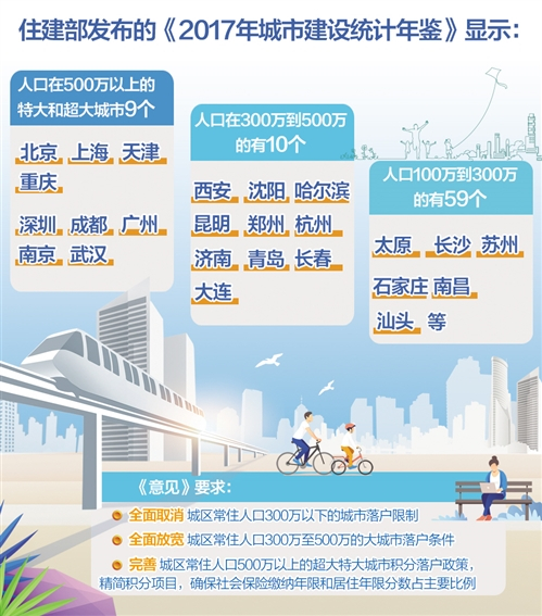 武汉大学中国发展战略与规划研究院副院长吴传清认为,这与今年4月国家发展改革委发布的《2019年新型城镇化建设重点任务》相互呼应,并更加深化。《重点任务》提出,继续加大户籍制度改革力度,在此前城区常住人口100万以下的中小城市和小城镇已陆续取消落户限制的基础上,城区常住人口100万至300万的Ⅱ型大城市要全面取消落户限制;城区常住人口300万至500万的Ⅰ型大城市要全面放开放宽落户条件,并全面取消重点群体落户限制。超大特大城市要调整完善积分落户政策,大幅增加落户规模、精简积分项目,确保社保缴纳年限和居住年限分数占主要比例。
