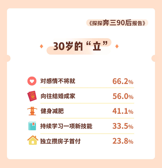 三十而立该怎么立?首批“90后”表示,最重要的“立”是对待感情坚持自己的态度,66.2%的受访者都选择“对感情不将就,但即便有自我的坚持,56%用户还是向往结婚成家的。同时,健身减肥、持续学习一项新技能也是大部分受访者对“立”的理解,分别占比41.1%、33.5%。还有23.8%的受访者则选择、独立攒房子首付。