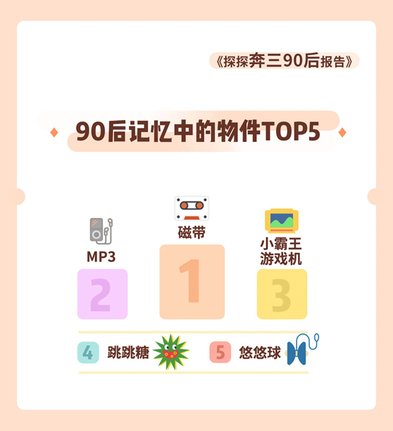 报告显示,首批“90后”最怀念的物件排名前五的分别是磁带 、MP3、小霸王游戏机、跳跳糖和悠悠球;而他们有关时代文化记忆最深的依次是还珠格格、背鲁迅课文、猫和老鼠、葫芦娃和流星花园。