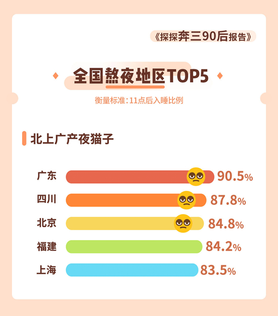 从熬夜的地区分布来看,广东、四川、北京是熬夜“重灾区”,上述地方的奔三“90后”能在11点后才入睡的比例分别为90.5%、87.8%、84.8%,其后便是福建84.2%、上海83.5%。