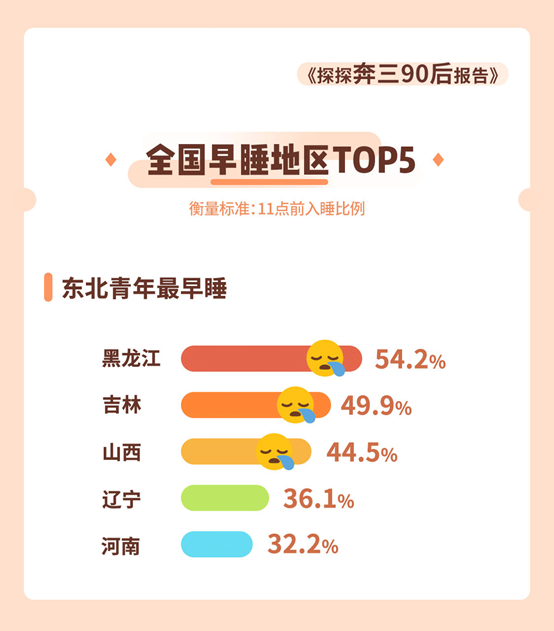 而黑龙江、吉林、山西、辽宁、河南的奔三“90后”却更能做到早睡,其在11点前入睡的比例分别54.2%、49.9%、44.5%、36.1%和32.2%。