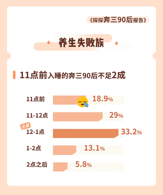 身体是革命的本钱。行至30岁这一人生关键节点,首批“90后”的睡眠数据略微有些“扎心”。报告显示,54.2%的受访者经常凌晨失眠。11点前入睡的人仅有18.9%。12点至凌晨1点入睡的最多,达33.2%,还有5.8%的受访者甚至2点之后才能入睡。