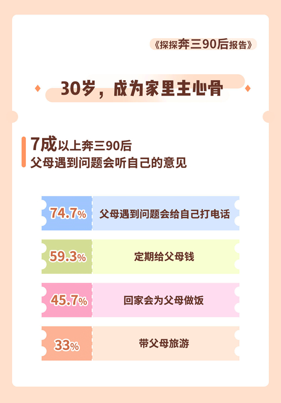 一个明显的特征是,七成以上( 74.7%)的奔三“90后”已经开始为他们的父母“拿主意”了。父母遇到问题时会打电话或发信息询问自己的意见,“叛逆”的“90后”正在逐渐成为家里的主心骨。