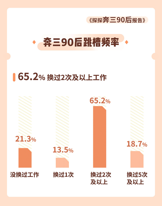 从奔三“90后”的工作跳槽频率来看,他们中只有 21.3%的人从没换过工作,13.5%的人跳槽 1 次,65.2%的人换过2次及以上工作,其中跳槽 5 次以上的奔三 “90后”比例达 18.7%。由此可见,父母那一辈传统的“铁饭碗”概念在奔三“90后”心中已不太能站得住脚。