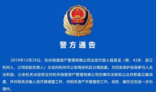 新浪财经讯 12月29日消息,杭州余杭公安今日通报称,杭州信釜资产有限公司(下称“信釜资产”)因涉嫌非法吸收公众存款被立案侦查,其实控人钱志龙主动投案,后者于2000年初加入阿里巴巴,阿里工号75。信釜资产运营“米庄理财”,爱财科技集团有限公司持有信釜资产80%股权。