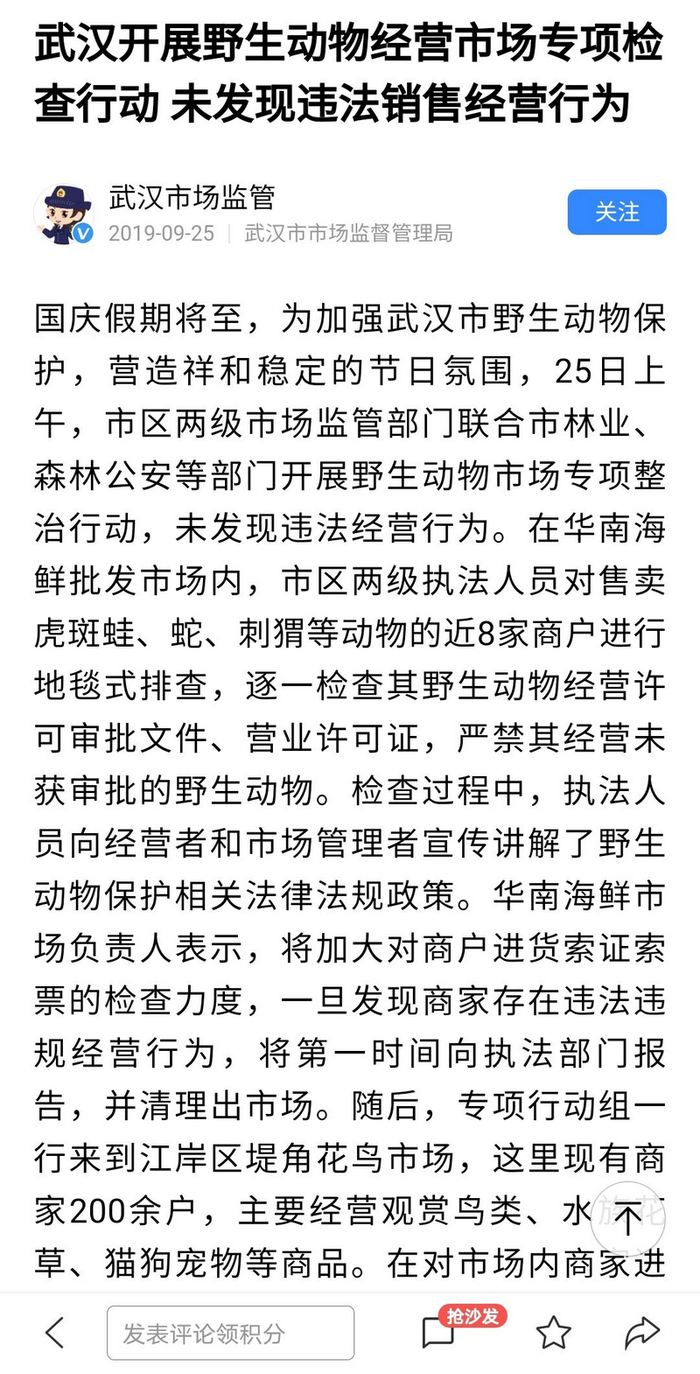 值得注意的是,根据武汉市市场监督管理局2019年9月25日发布的消息,当天上午,市区两级市场监管部门联合市林业、森林公安等部门开展野生动物市场专项整治行动,未发现违法经营行为。