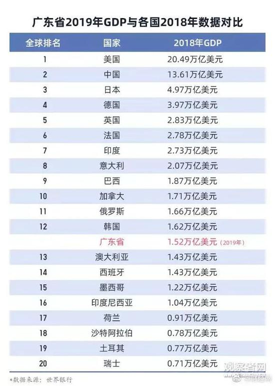 如果将广东放在世界所有国家和地区来比较,超10万亿的GDP总量,可以排在全球前15名之内。