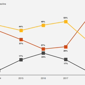 接受调查的1581位全球顶级CEO中,有超过半数(53%)的CEO认为接下来的经济增速会进一步放缓。在过去两年内,这个比例从5%飙升到了53%,标志着CEO的悲观情绪创下历史新高水平。根据去年同期调查,2019年初持悲观态度的CEO仅占29%。