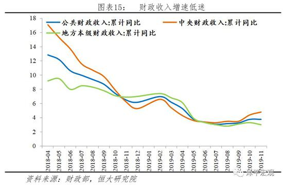 一是城镇化进程以及基础设施建设的巨额资金需求推动债务规模扩张和土地财政。二是地方政府的财力与支出责任不匹配,即使有转移支付,地方政府仍承担大量中央和地方共同支出责任。2018年中央政府通过转移支付和税收返还给地方后,地方政府收入(本级公共财政+转移支付)占全国财政收入比为91.4%,但地方政府收入与支出比仍为89%,还有11%的支出依赖举债。三是预算软约束和GDP导向的政绩考核体系助长了地方政府的举债冲动。四是近年来我国经济增速放缓,且实施减税降费力度较大,财政收入增速连续四年低于名义GDP增速,而改革、发展和稳定及社保和利息支出的压力较大,地方财政捉襟见肘,偿债能力下降,风险上升。2015-2018年财政收入增速分别为5.8%、4.5%、7.4%和6.2%,低于GDP名义增速的7%、7.9%、10.9%和9.7%;2019年全国公共财政收入增长持续放缓,1-11月累计同比为3.8%,远低于名义GDP增速。
