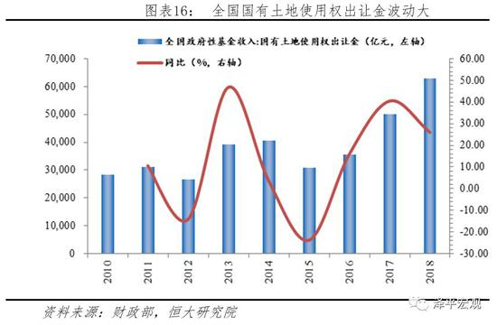 土地出让收入是除公共财政收入之外地方政府的主要收入来源,但受房地产市场调控的影响较大,具有不稳定性、不可持续性,与房地产风险捆绑。2010年-2018年全国国有土地出让收入波动幅度较大,2013年地方土地使用权出让金为4.13万亿元,增幅达44.6%,2014-2018年同比为3.2%、-21.4%、15.1%、40.7%和25%。