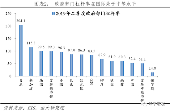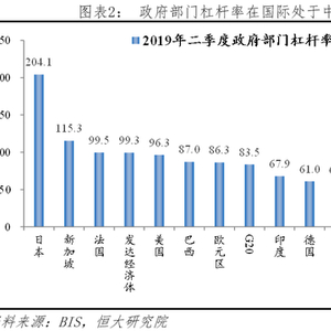 政府部门杠杆率在国际上处于中等水平,政府债务风险整体可控。衡量政府杠杆率主要有负债率、债务率指标,负债率=债务余额/GDP,债务率=债务余额/综合财力。其中,债务余额可分为显性债务、含隐性债务的全部债务等口径;综合财力可分为一般公共预算、一般公共预算+政府性基金收入+国有资本经营收入+社会保险基金收入,在地方政府层面还可细分为是否包含中央转移支付及税收返还等口径。不同机构对我国政府债务测算的结果有差异。据BIS数据,截至2019年二季度中国政府部门杠杆率为52.4%,与发展中经济体均值51.1%相当,低于通行的60%警戒线,并显著低于G20成员均值83.5%。发达经济体政府部门杠杆率均值为99.3%,其中日本杠杆率高达204.1%,因此尽管60%警戒线有一定参考价值,但并非杠杆率高于60%就会引发系统性金融危机,对于政府部门杠杆率提高不必过度担忧。