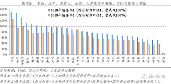 分省市看,贵州、青海、海南等地债务风险相对较高。负债规模方面,2018年末债务余额规模前五的地区为江苏、山东、浙江、广东和四川,分别为13286、11437、10794、10008和9299亿元。负债率方面,以债务余额/GDP衡量,青海(61.5%)、贵州(59.7%)、海南(40.2%)、云南(39.9%)、内蒙(37.9%)和宁夏(37.5%)靠前;广东(10.3%)、上海(14.3%)、江苏(15%)相对较低。债务率方面,以债务余额/综合财力衡量,有6个省市突破国际警戒线100%,分别是贵州(149.7%)、辽宁(144.6%)、内蒙古(130.3%)、云南(109.9%)、天津(106.8%)和湖南(101.7%),青海、海南债务率接近100%,分别为99.9%和99.6%。