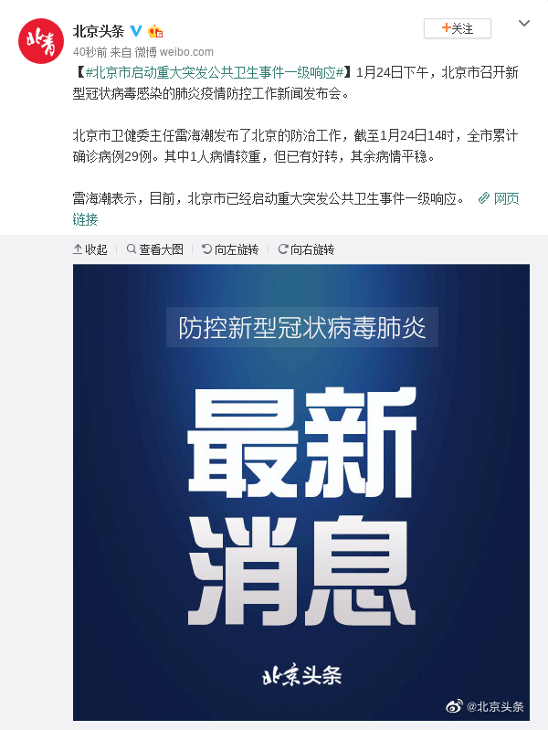 原标题:北京市启动重大突发公共卫生事件一级响应
