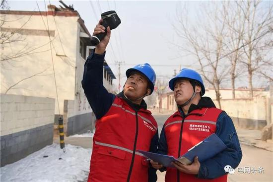 1月24日,山东淄博供电公司员工钱玉、赵金光在马尚镇高北村“煤改电”台区负荷高峰期开展测温测负荷工作。(伊东)