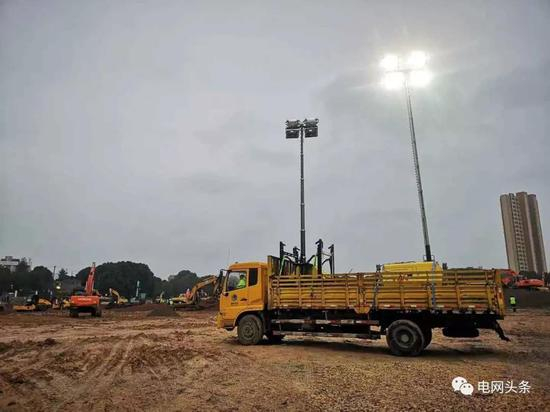 1月24日农历大年三十,湖北武汉供电公司华源输变电工程公司为火神山医院施工现场提供24小时照明服务。(杜鹃 高维敏)