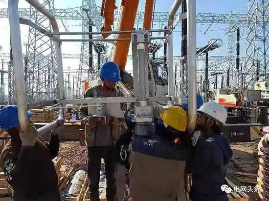 1月24日,巴基斯坦默—拉直流输电项目现场施工正常进行,中电装备公司员工正在安装500千伏隔离开关。(俞洋)