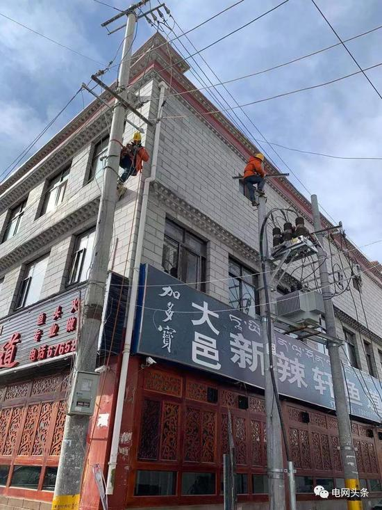 1月25日,西藏拉萨供电公司员工达瓦扎西、尼玛曲桑在拉萨城关区加措居委会更换低压导线。(嘎玛玉珍)