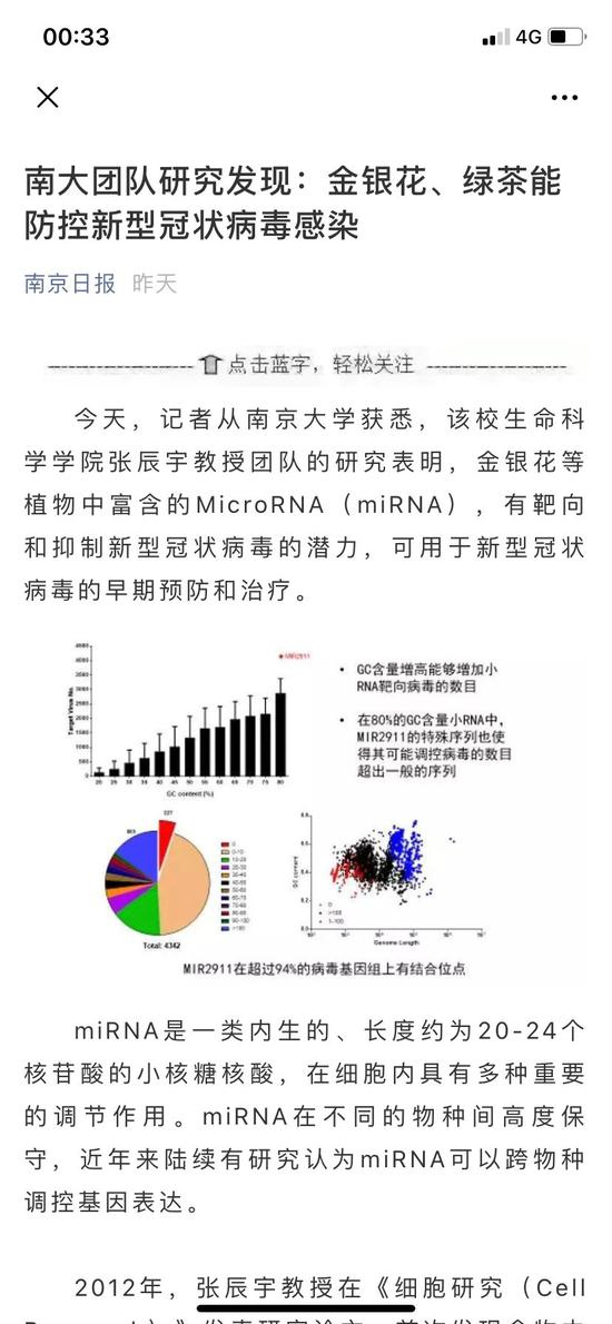 报道中称,(南京日报)记者从南京大学获悉,该校生命科学学院张辰宇教授团队的研究表明,金银花等植物中富含的MicroRNA(miRNA),有靶向和抑制新型冠状病毒的潜力,可用于新型冠状病毒的早期预防和治疗。