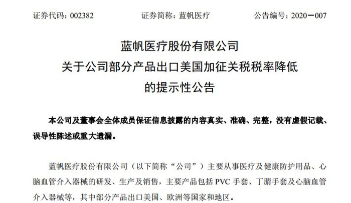 2月5日晚间,蓝帆医疗就披露公告,公司出口至美国产品关税降低后利好公司业绩。