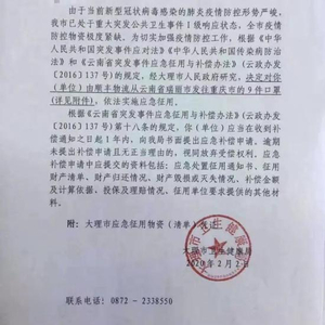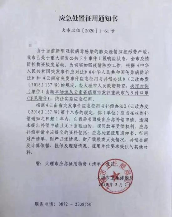 2月2日,一份落款为大理市卫生健康局的《应急处置征用通知书》(下称《通知书》显示,一批从云南瑞丽市发往重庆的9件口罩,被大理市政府应急征用。