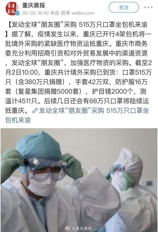 实际上,面对医疗防护物资紧缺,重庆此前已开启“全球采购模式”。