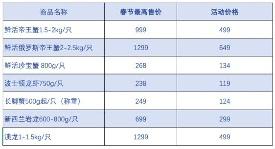 盒马方面介绍,包括帝王蟹、珍宝蟹、黄金蟹、波士顿龙虾在内的盒马招牌海鲜商品,价格已下探到历年春节最低,新西兰岩龙价格也下降到一半以下,澳大利亚的龙虾相当于春节价格的三折。