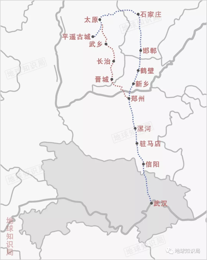 蓝线为目前武汉到平遥的最佳高铁路径,