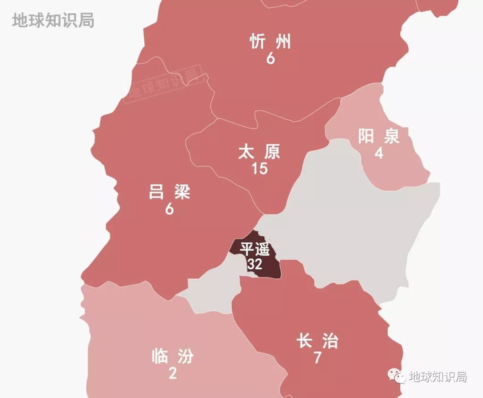 而且晋中市的32名感染者,所在地并不集中在太原隔壁的“市中心”榆次,而是在比“榆次”和“晋中”两个地名还要知名的平遥县。