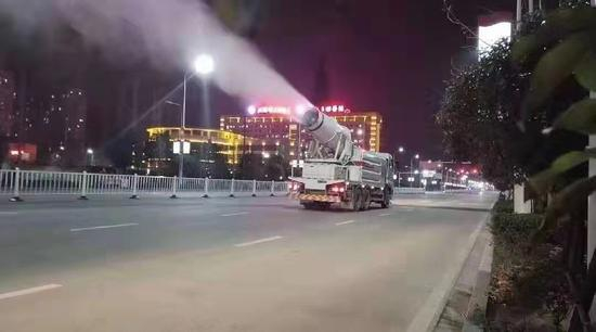 到了深夜,雾炮车会对中心城区所有街道喷洒消毒液。