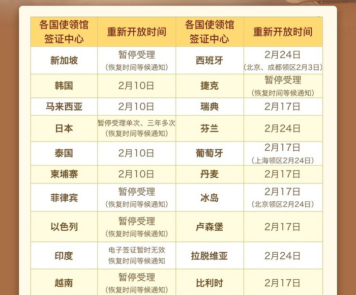 据携程的统计数据,把包括韩国、马来西亚、泰国、柬埔寨、俄罗斯等国的签证中心最早已经于2月10日重新开放;瑞典、比利时、挪威、荷兰等国的签证中心已经于2月17日重新开放;西班牙、意大利、新西兰等国的签证中心将在2月24日重新开放。新加坡、捷克、菲律宾、美国、英国等暂无重新开放的消息。