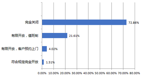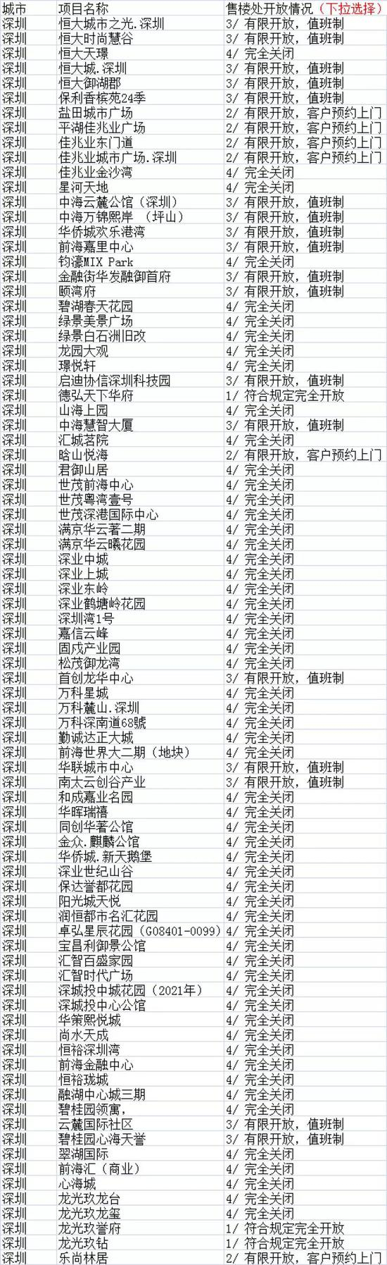 2月19-20日两天,深圳乐居对全市(含深汕合作合)逾两百家售楼处进行调查,结果显示,仅有三家售楼处完全开放;51家采取有限开放模式,其中有8家为预约制,即客户须提前预约,才可前来咨询、签约,另外43家为值班制,即有工作人员(置业顾问或物业)在售楼处值班,客户可直接上门看房;其余售楼处仍处于关闭状态,占比超七成。
