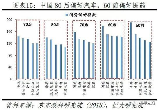 从消费看,老龄化提高消费占比但降低消费增速,并引发消费结构变迁,比如医疗保健占比将逐渐提升。根据生命周期消费理论,老年人平均消费倾向高,老龄化会提高消费占比但降低消费增速。中国居民消费占GDP的比例于2010年达谷值,2010-2018年居民消费占比从35.6%升至39.0%,居民消费支出增速从15.3%降至9.5%。并且,不同世代消费偏好存在差异,如80后偏好母婴、汽车,60和70后偏好酒类,60前偏好医药保健等,因此人口年龄结构变化对不同行业影响各异。比如,25-54岁人群2017年见顶,烟酒销售增速后将放缓;20-50岁主力置业人群2013年见顶,住宅新开工面积2011、2013年达约14亿平的双峰,家电、家具、建筑装潢等地产相关行业合计消费增速2010年见顶;25-45岁主力购车人群占比2003年见顶,汽车销量增速在波动中下滑,2018年首次出现负增长,但新能源汽车潜力巨大;老龄化促进医疗保健消费占比2013-2018年从6.2%升至7.8%。