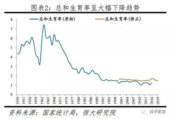 继2018年中国出生人口下降200万后,2019年出生人口再下降58万至1465万。新中国成立以来,中国先后出现三轮婴儿潮,分别为1950-1958年的年均2100万,1962-1975年的年均2628万,1981-1994年的2246万,之后逐渐下滑至2003-2012年的1600万上下,其中2012年为1635万。中国总和生育率从1970年代之前的6左右,降至1990年的2左右,再降至2010年后的1.5左右。第四轮婴儿潮原本应在2010年后出现,但因长期严格执行的计划生育而消失。在上述背景下,独生子女政策终于有所松动,2012年末中央决定实施单独二孩政策,但效果不及预期,2013-2015年出生人口分别为1640、1687、1655万。2015年末中央决定全面放开二孩,出生人口在2016年达1786万、创2000年以来峰值;但2017年即下滑至1725万,2018年再下降200万至1523万,2019年为1465万。