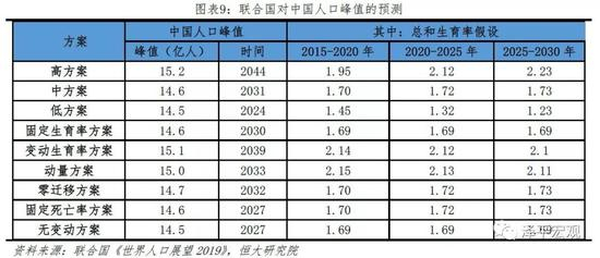 联合国对中国人口增长同样存在高估,中方案预测2031年达14.6亿人的峰值。联合国《世界人口展望(2019)》对中国人口有9个预测方案,其中中方案假设2015-2020年、2020-2025年、2025-2030年中国总和生育率分别为1.70、1.72、1.73,进而预测中国人口将在2031年迎来14.6亿的峰值。此外,其低方案假设2015-2020年、2020-2025年、2025-2030年中国总和生育率分别为1.45、1.32、1.23,人口将于2024年达到14.5亿的峰值。