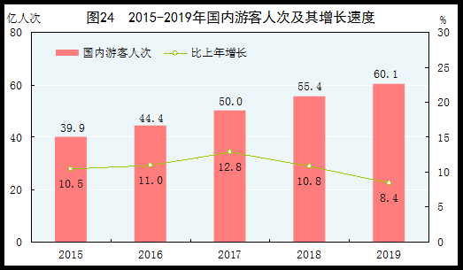 全年国内游客60.1亿人次,比上年增长8.4%;国内旅游收入57251亿元,增长11.7%。入境游客14531万人次,增长2.9%。其中,外国人3188万人次,增长4.4%;香港、澳门和台湾同胞11342万人次,增长2.5%。在入境游客中,过夜游客6573万人次,增长4.5%。国际旅游收入1313亿美元,增长3.3%。国内居民出境16921万人次,增长4.5%。其中因私出境16211万人次,增长4.6%;赴港澳台出境10237万人次,增长3.2%。