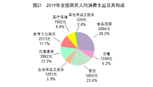 全年全国居民人均消费支出21559元,比上年增长8.6%,扣除价格因素,实际增长5.5%。其中,人均服务性消费支出[62]9886元,比上年增长12.6%,占居民人均消费支出的比重为45.9%。按常住地分,城镇居民人均消费支出28063元,增长7.5%,扣除价格因素,实际增长4.6%;农村居民人均消费支出13328元,增长9.9%,扣除价格因素,实际增长6.5%。全国居民恩格尔系数为28.2%,比上年下降0.2个百分点,其中城镇为27.6%,农村为30.0%。