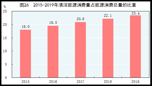 初步核算,全年能源消费总量[81]48.6亿吨标准煤,比上年增长3.3%。煤炭消费量增长1.0%,原油消费量增长6.8%,天然气消费量增长8.6%,电力消费量增长4.5%。煤炭消费量占能源消费总量的57.7%,比上年下降1.5个百分点;天然气、水电、核电、风电等清洁能源消费量占能源消费总量的23.4%,上升1.3个百分点。重点耗能工业企业单位电石综合能耗下降2.1%,单位合成氨综合能耗下降2.4%,吨钢综合能耗下降1.3%,单位电解铝综合能耗下降2.2%,每千瓦时火力发电标准煤耗下降0.3%。全国万元国内生产总值二氧化碳排放下降4.1%。