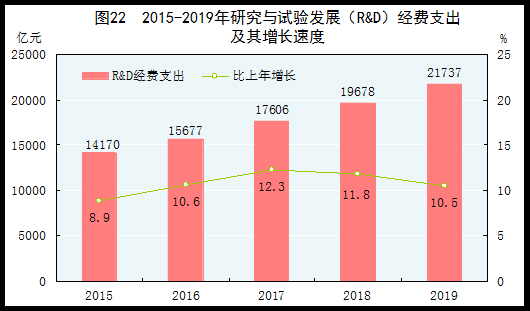 全年研究与试验发展(R&D)经费支出21737亿元,比上年增长10.5%,与国内生产总值之比为2.19%,其中基础研究经费1209亿元。国家科技重大专项共安排234个课题,国家自然科学基金共资助45192个项目。截至年底,正在运行的国家重点实验室515个,累计建设国家工程研究中心133个,国家工程实验室217个,国家企业技术中心1540家。国家科技成果转化引导基金累计设立21支子基金,资金总规模313亿元。国家级科技企业孵化器[65]1177家,国家备案众创空间[67]1888家。全年境内外专利申请438.0万件,比上年增长1.3%;授予专利权259.2万件,增长5.9%;PCT专利申请受理量[68]为6.1万件。截至年底,有效专利972.2万件,其中境内有效发明专利186.2万件,每万人口发明专利拥有量13.3件。全年商标申请783.7万件,比上年增长6.3%;商标注册640.6万件,增长27.9%。全年共签订技术合同48.4万项,技术合同成交金额22398亿元,比上年增长26.6%。